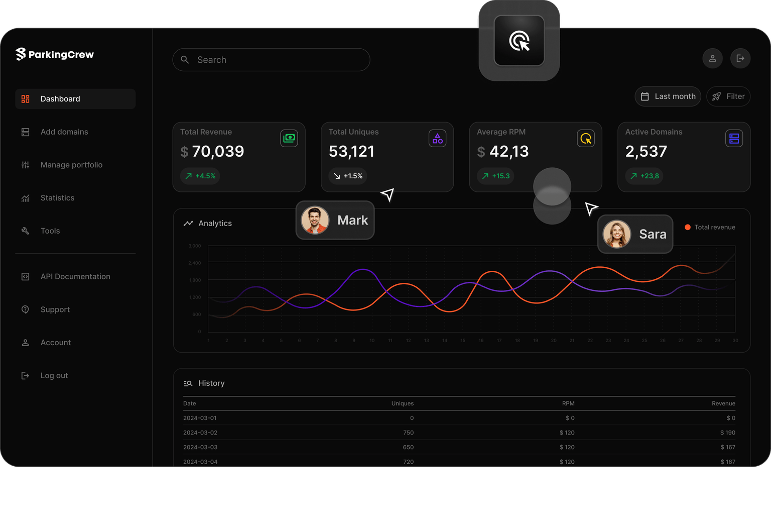 see a user-friendly, mobile responsive interface that allows for easy management of domains, including domain setup, unrestricted commission-free domain sales, and performance tracking.